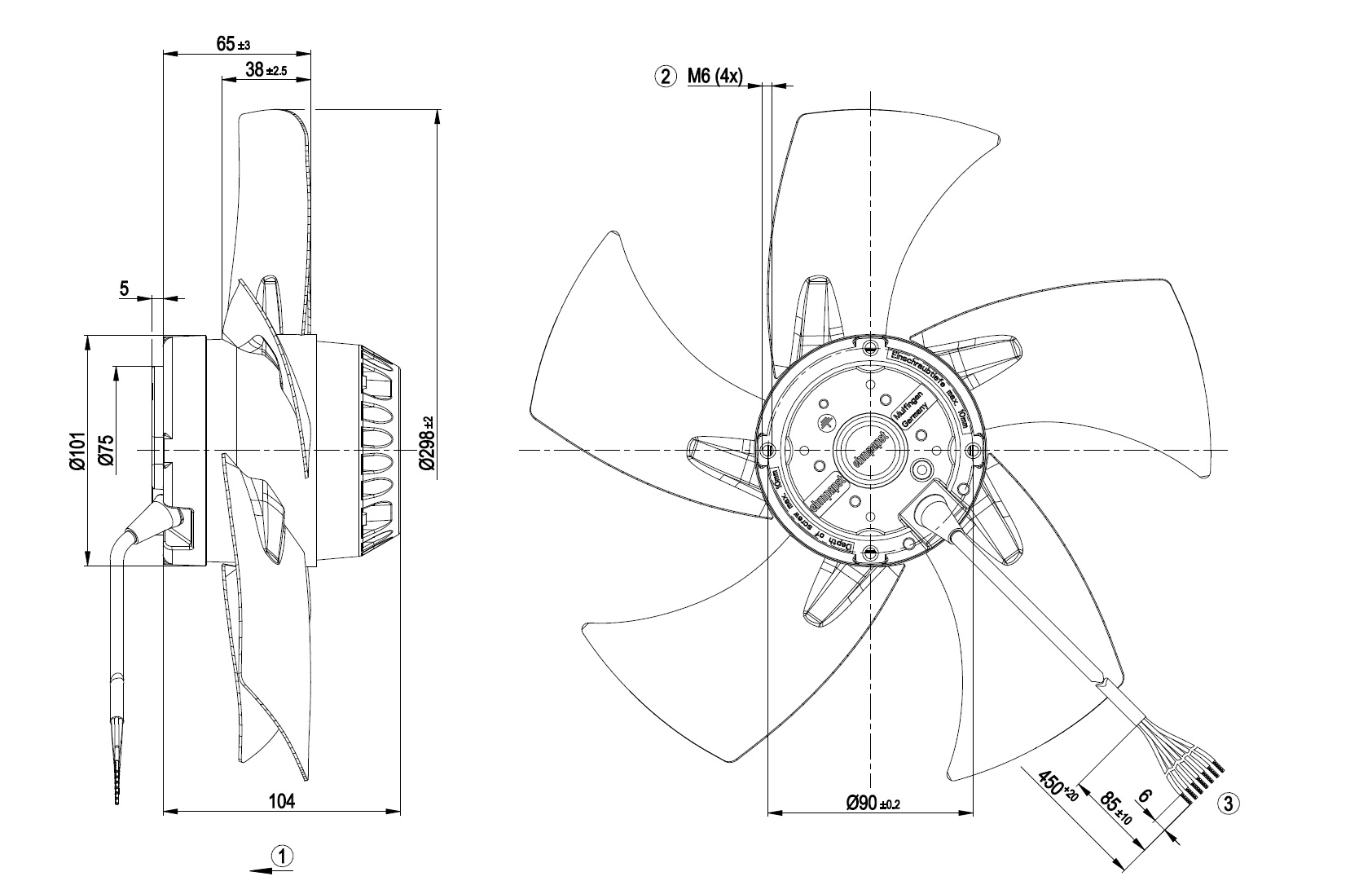 Замеры производительности соответствуют ISO 5801 категория А. Для детального уточнения способа замеров, Вам необходимо обратиться к специалистам ebm-papst. Уровень звукового давления со стороны всасывания: LwA по ISO 13347 / LpA с расстоянием 1м от оси вентилятора. Данные действительны только при указанных условиях измерения и могут варьироваться в зависимости от условий установки. При отклонении от стандартной конфигурации, необходимо проверить все значения в собранной установке.