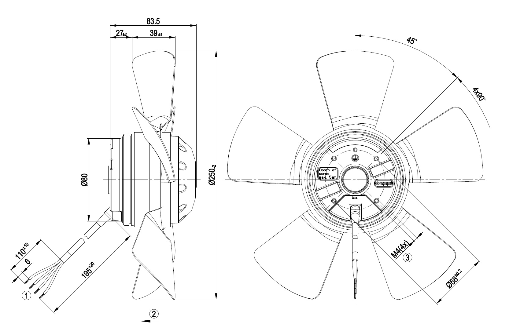 Замеры производительности соответствуют ISO 5801 категория А. Для детального уточнения способа замеров, Вам необходимо обратиться к специалистам ebm-papst. Уровень звукового давления со стороны всасывания: LwA по ISO 13347 / LpA с расстоянием 1м от оси вентилятора. Данные действительны только при указанных условиях измерения и могут варьироваться в зависимости от условий установки. При отклонении от стандартной конфигурации, необходимо проверить все значения в собранной установке.